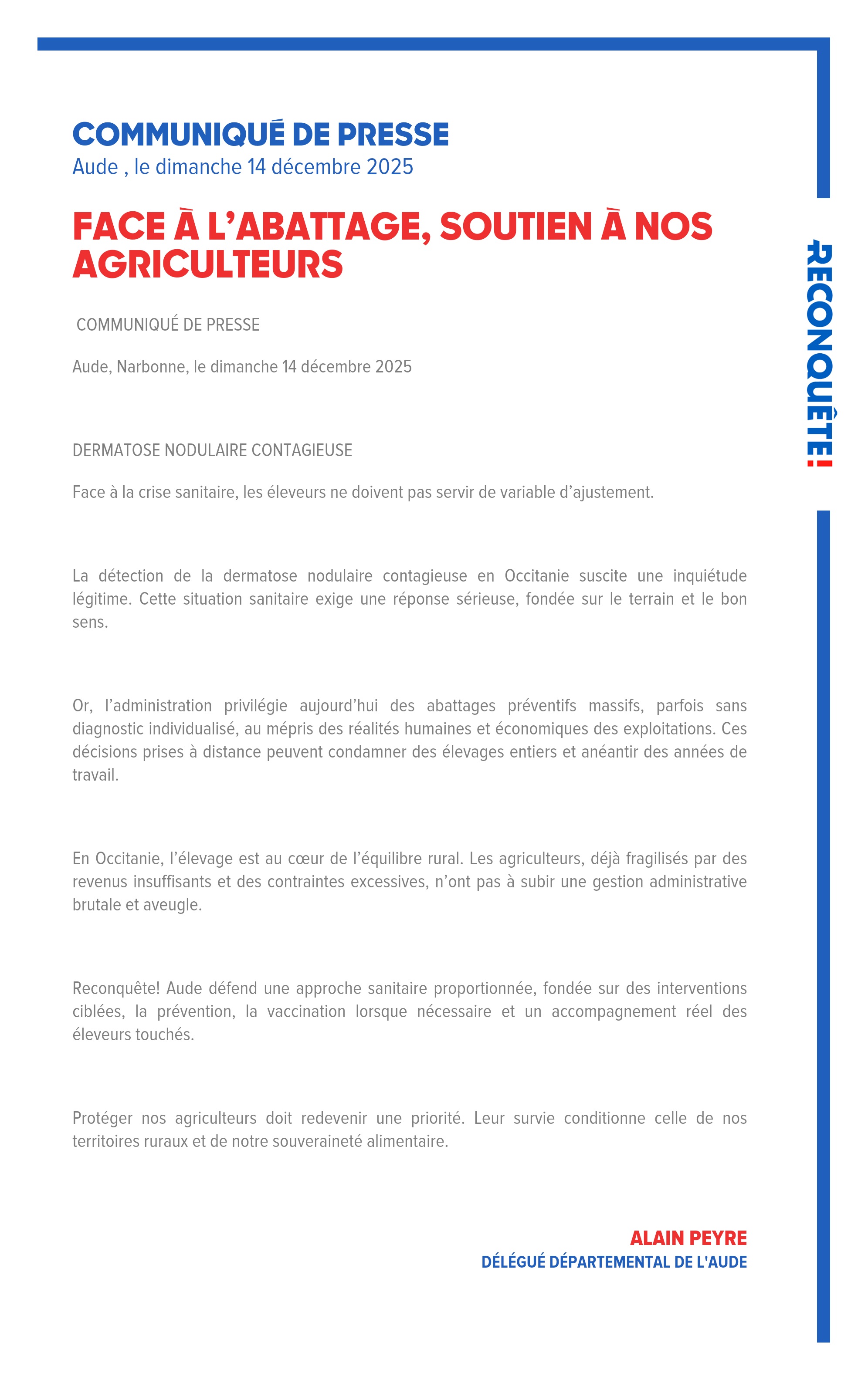Reconquête! Aude défend une approche sanitaire proportionnée, fondée sur des interventions ciblées, la prévention, la vaccination lorsque nécessaire et un accompagnement réel des éleveurs touchés.