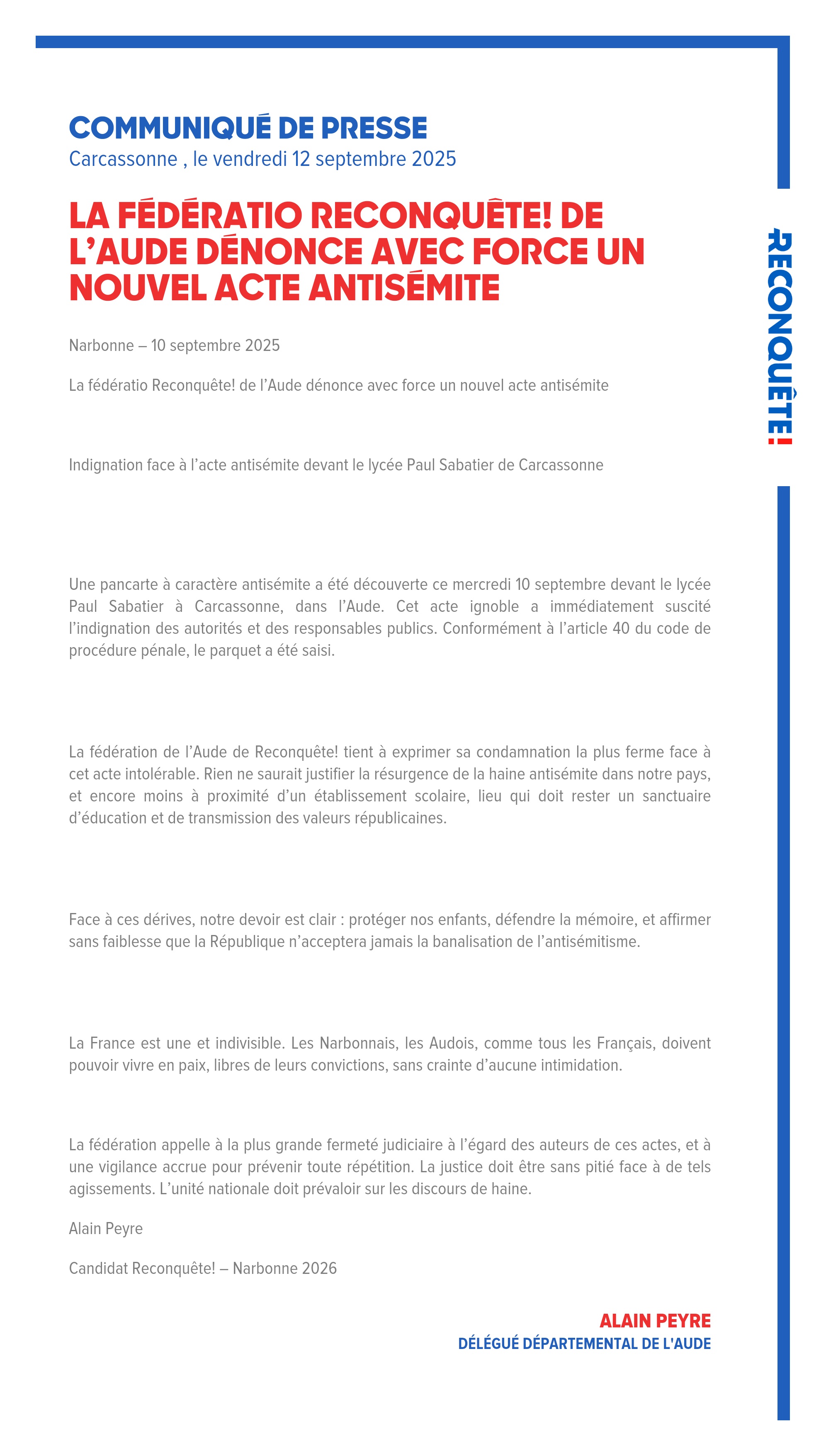 La fédération de l’Aude de Reconquête! tient à exprimer sa condamnation la plus ferme face à cet acte intolérable. Rien ne saurait justifier la résurgence de la haine antisémite dans notre pays, et encore moins à proximité d’un établissement scolaire, lieu qui doit rester un sanctuaire d’éducation et de transmission des valeurs républicaines.