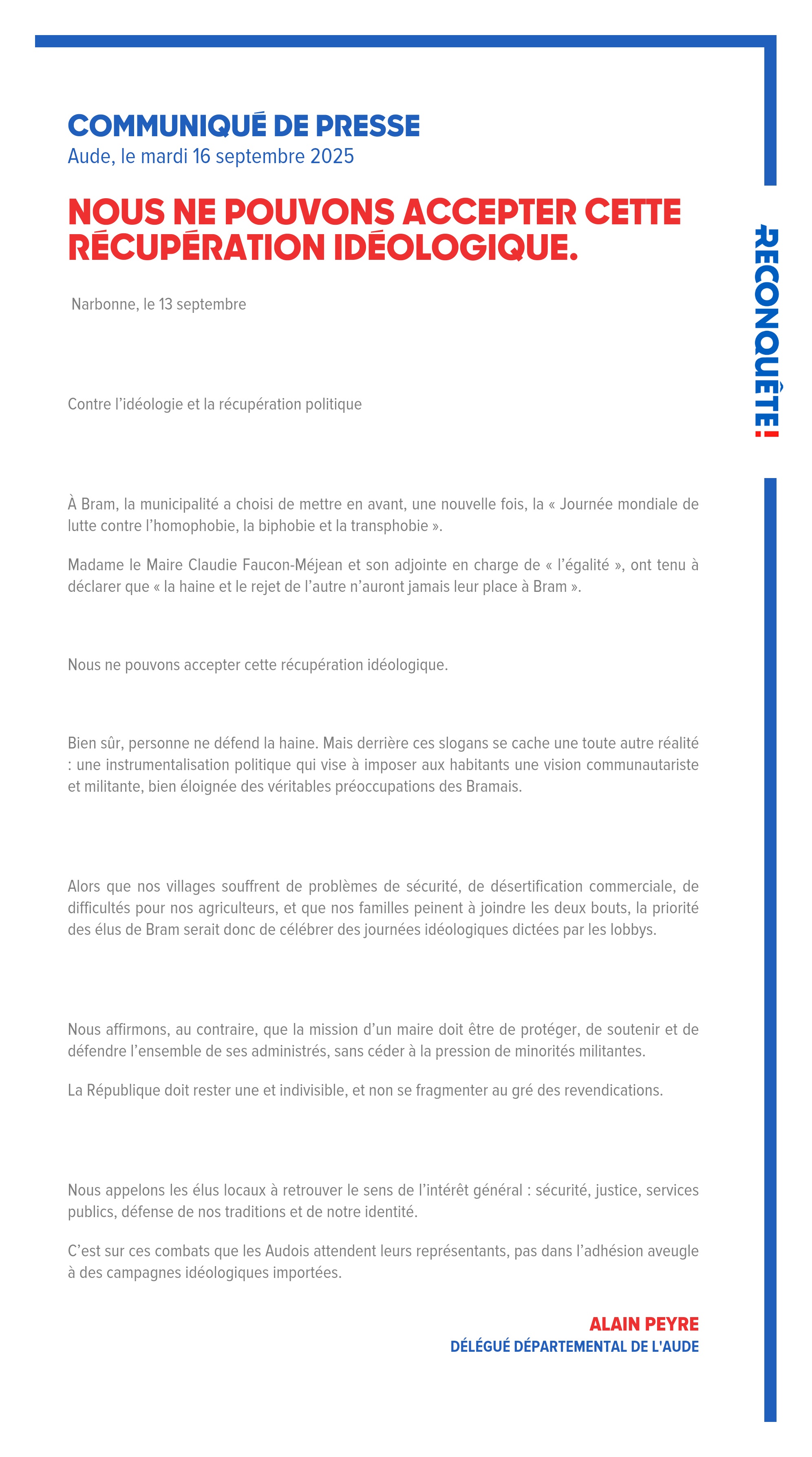 C’est sur ces combats que les Audois attendent leurs représentants, pas dans l’adhésion aveugle à des campagnes idéologiques importées.