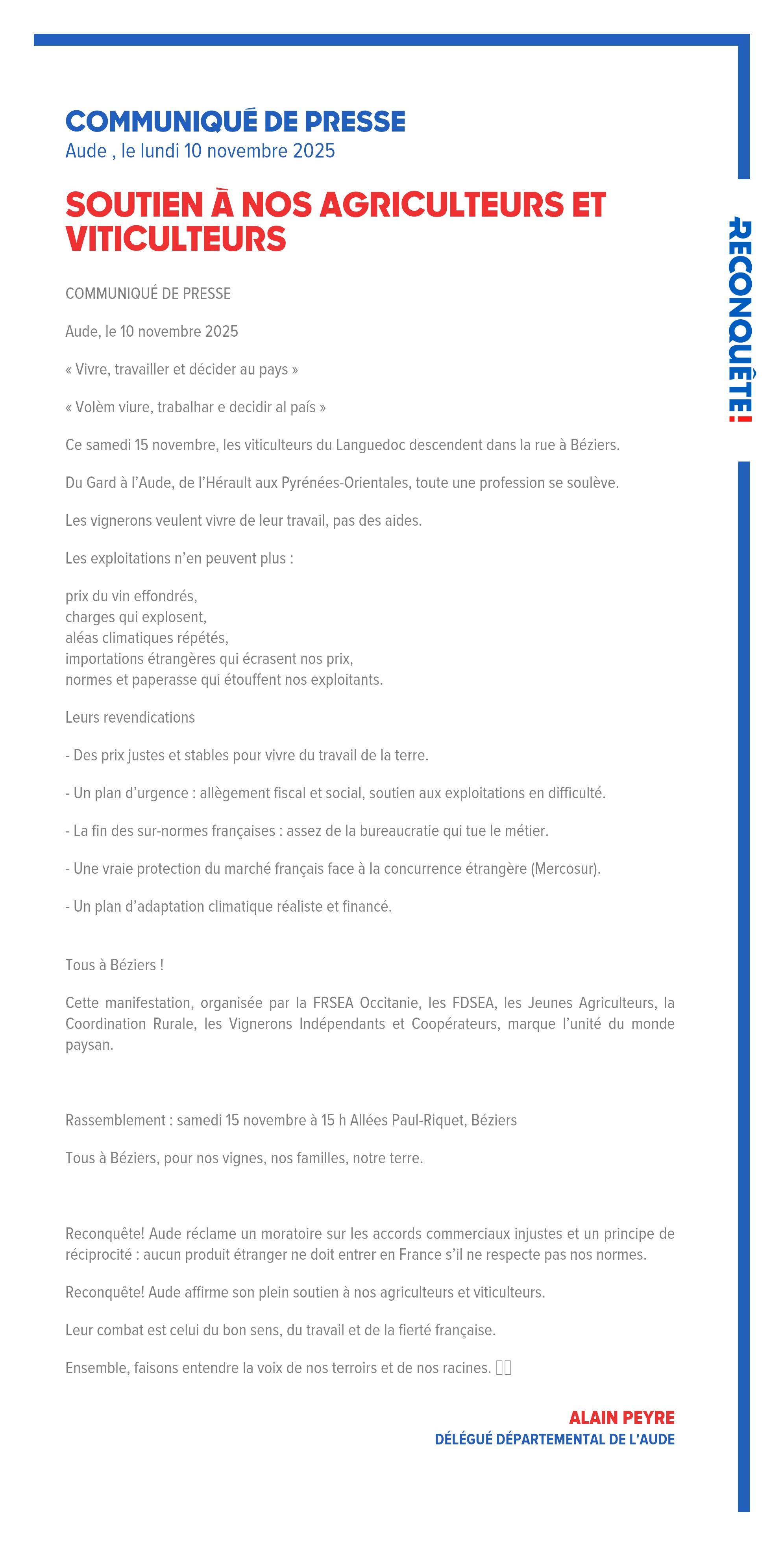 Reconquête! Aude affirme son plein soutien à nos agriculteurs et viticulteurs.